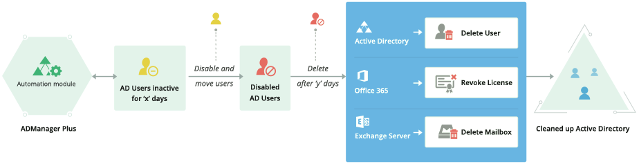 Automate AD cleanup by using an automation policy to define when and in what order the cleanup activities need to be performed. For example, configure an automation policy such that inactive users (as provided via the inactive users report) are disabled, then moved to another OU after x number of days, and ultimately deleted after y number of days. Implement this automation policy in an automation and specify how often the automation should run.
