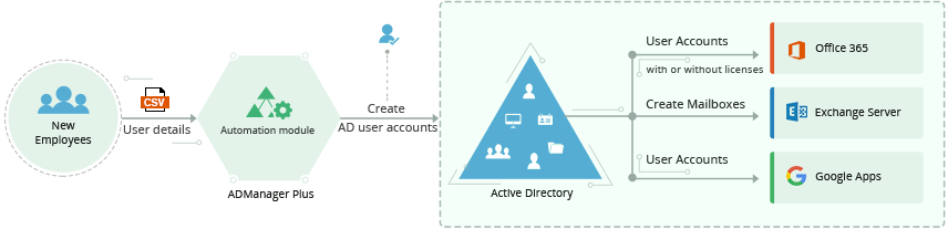 Provision user accounts in Active Directory, Office 365, Exchange, Skype for Business/Lync, and Google Workspace simultaneously. Combined with the option to import users list from a CSV file, and use customized templates to provision user accounts exactly the way a department or a branch needs them, creating multiple user accounts, all at once, is turned into an effortless and completely hands-free activity.